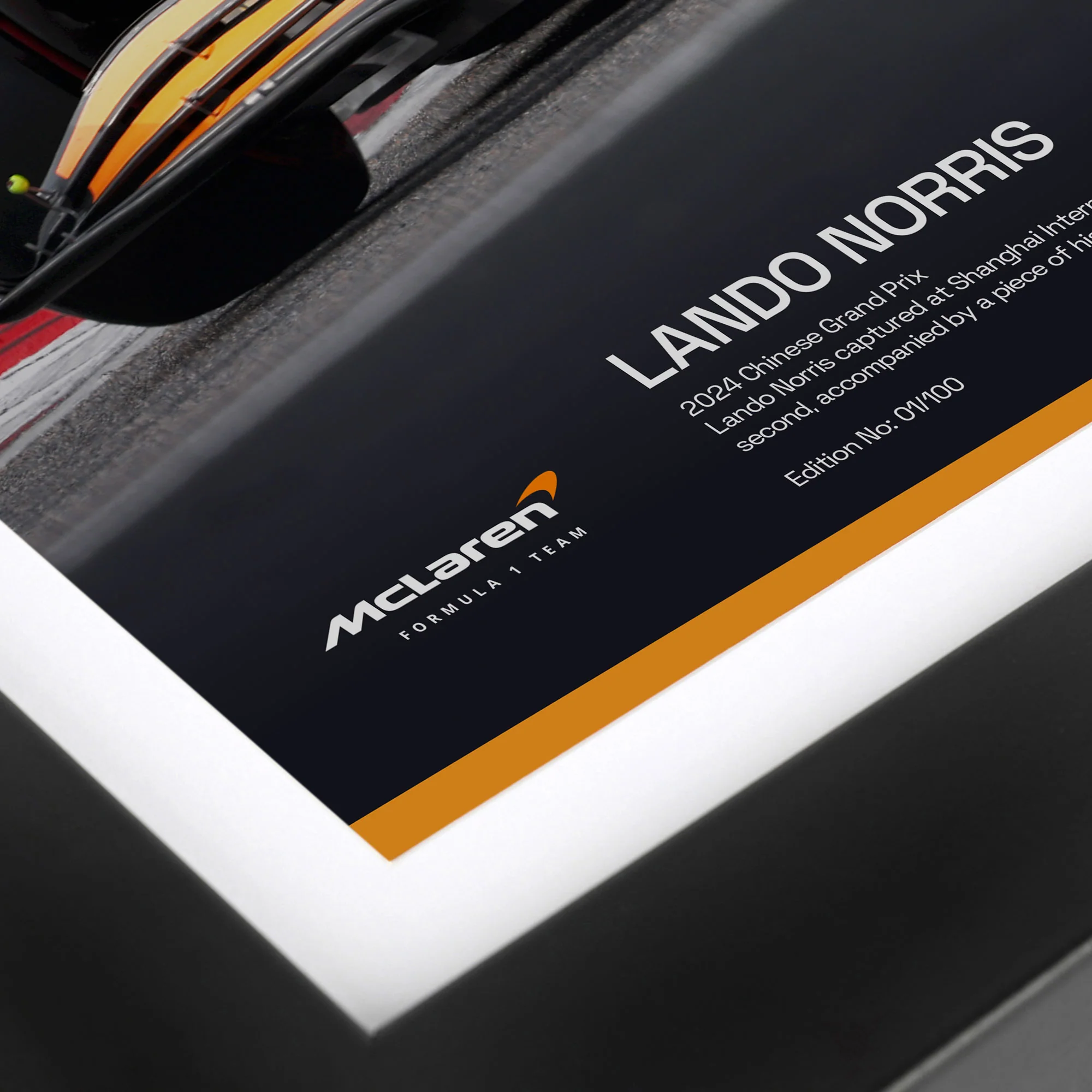This is a real piece of Formula 1 history, a real piece of the MCL38 that was used at the Chinese GP. A race-used piece of bodywork, cut from the McLaren sidepod using high-pressure water jets, and now it is framed alongside the British driver tackling the Shanghai International Circuit forever. This is your chance, to own history.